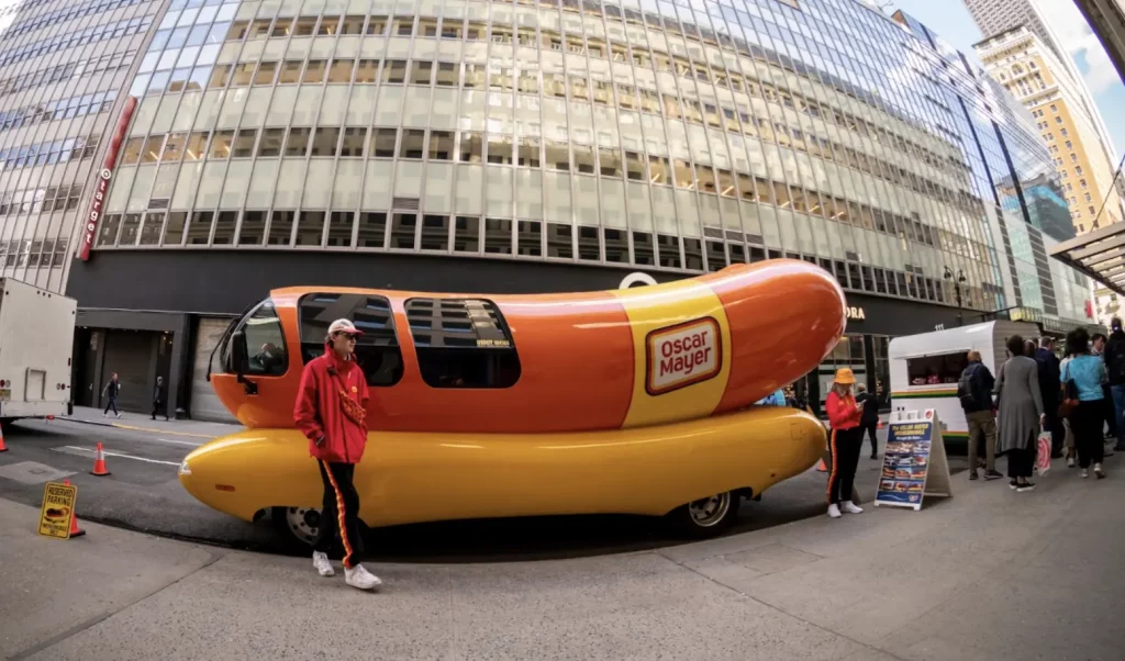 The Oscar Mayer Weinermobile is seen parked outside Advertising Week New York in 2023. Photo via rblfmr/Shutterstock