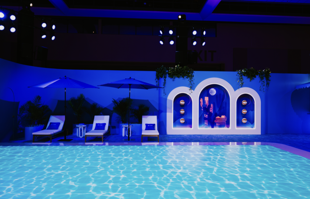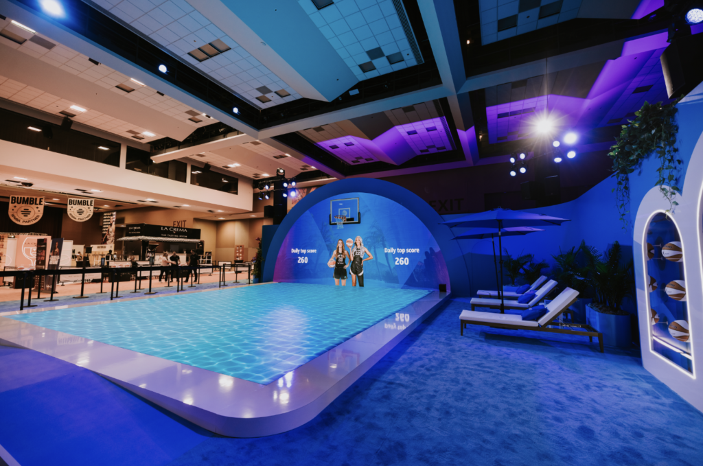 Schoeneberger said, pointing to the AT&T Fan Zone that Bluewater Technologies produced at WNBA Live as an example of their relationship. The installation—which came to life in Phoenix in July 2024—was immersive for its 28-by-13-foot LED wall and 24-by-30-foot LED floor combo that transported guests onto a water-themed basketball court. (Branded courtside lounge chairs made for a nice touch.)